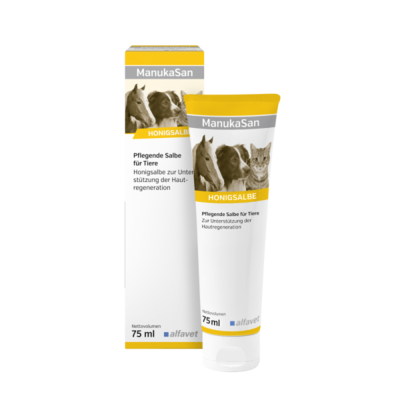 ManukaSan bietet eine Wundabdeckung von dauerhafter Sterilität, die zu 100% aus natürlichen Komponenten besteht. Neben bioaktivem Manuka Honig enthält die Salbe unter anderem epidermale Wachstumsfaktoren (EGF‘s) aus Colostrum. Durch einen einzigartigen Synergieeffekt beider Stoffe, kann eine bemerkenswert beschleunigte Geweberegeneration ohne Narbenbildung unterstützt werden. Die Salbe mindert zudem Juckreiz und Wundschmerz und hält durch ätherisches Lavendelöl sowohl Insekten als auch das Tier selbst von der Wunde fern, sodass eine ungestörte Heilung gesichert ist.