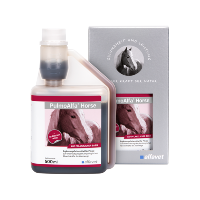 PulmoAlfa® Horse dient der biologisch hochwertigen Ergänzung der Nahrung mit pflanzlichen Substanzen, die die physiologischen Abwehrkräfte der Atemwege unterstützen. Darüber hinaus sind wohltuende natürliche Aromastoffe enthalten (Efeuextrakt und Eibischtinktur).