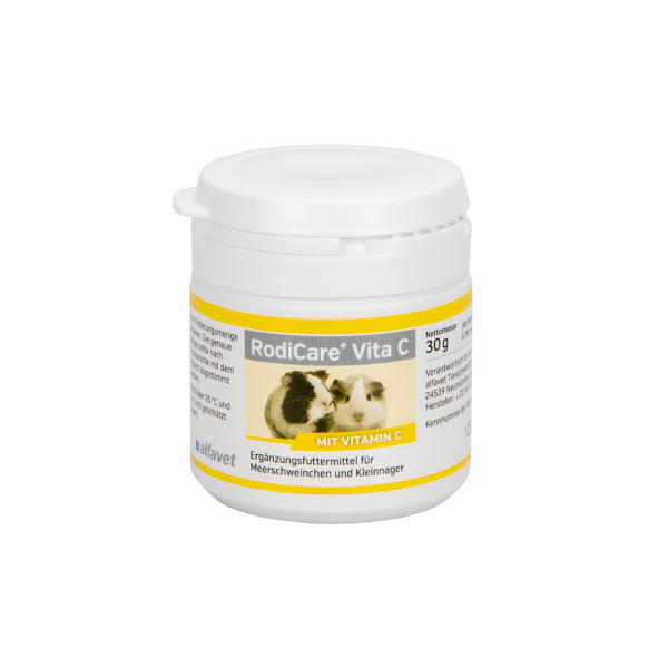 RodiCare® Vita C dient der Ergänzung der Nahrung mit Vitamin C. Meerschweinchen sind nicht wie andere Säugetiere in der Lage Vitamin C selbst zu synthetisieren. Ein Mangel an Vitamin C kann bei einseitiger Ernährung entstehen. Aber auch Infektionen, Verdauungsstörungen, Belastung und Stress können bei Meerschweinchen und Kleinnagern einen erhöhten Bedarf zur Folge haben. Überschüssiges Vitamin C wird über die Nieren ausgeschieden.