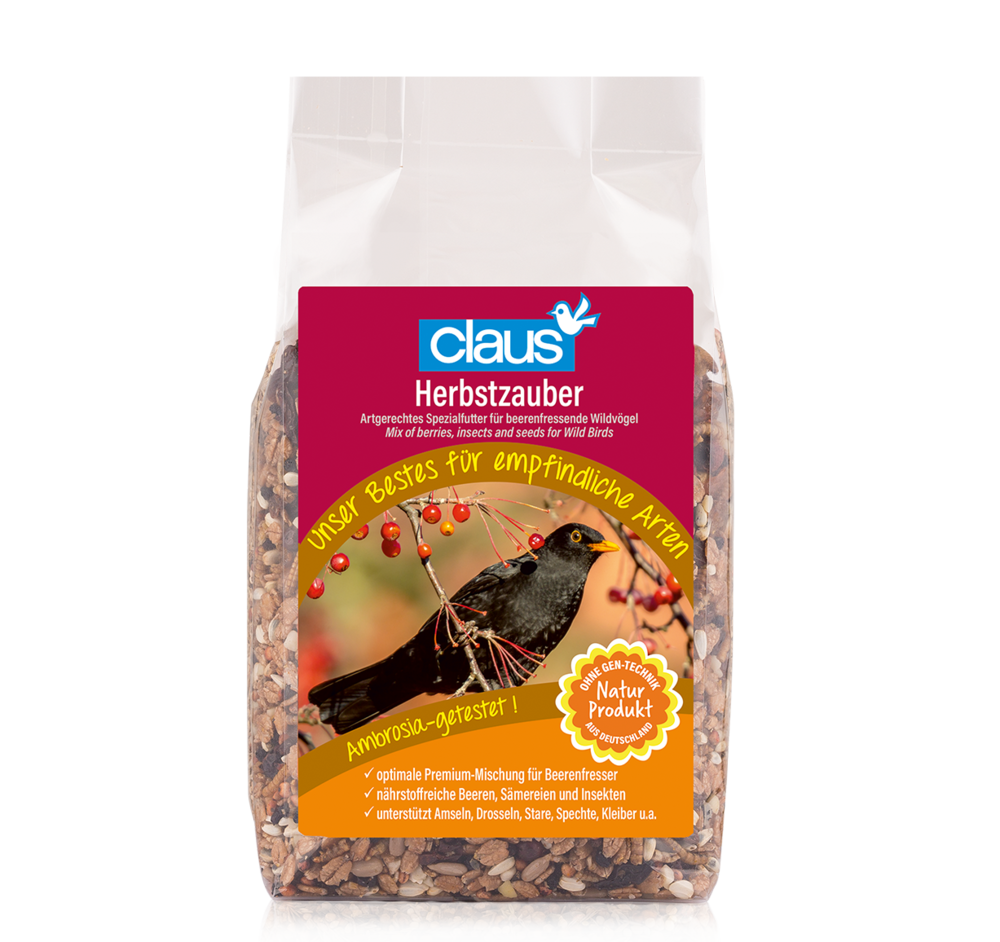 Nahrungsengpässe auszugleichen. Unser Herbstzauber ist ein eigens für Beerenfresser zusammengestelltes Premiumfutter aus vitaminreichen, schonend getrockneten Beeren, hochwertigen Saaten, Nüssen und Insekten. Ergänzt wird es durch aufgeschlossene Getreideflocken, die von den Vögeln gut aufgenommen werden und ihnen wichtige